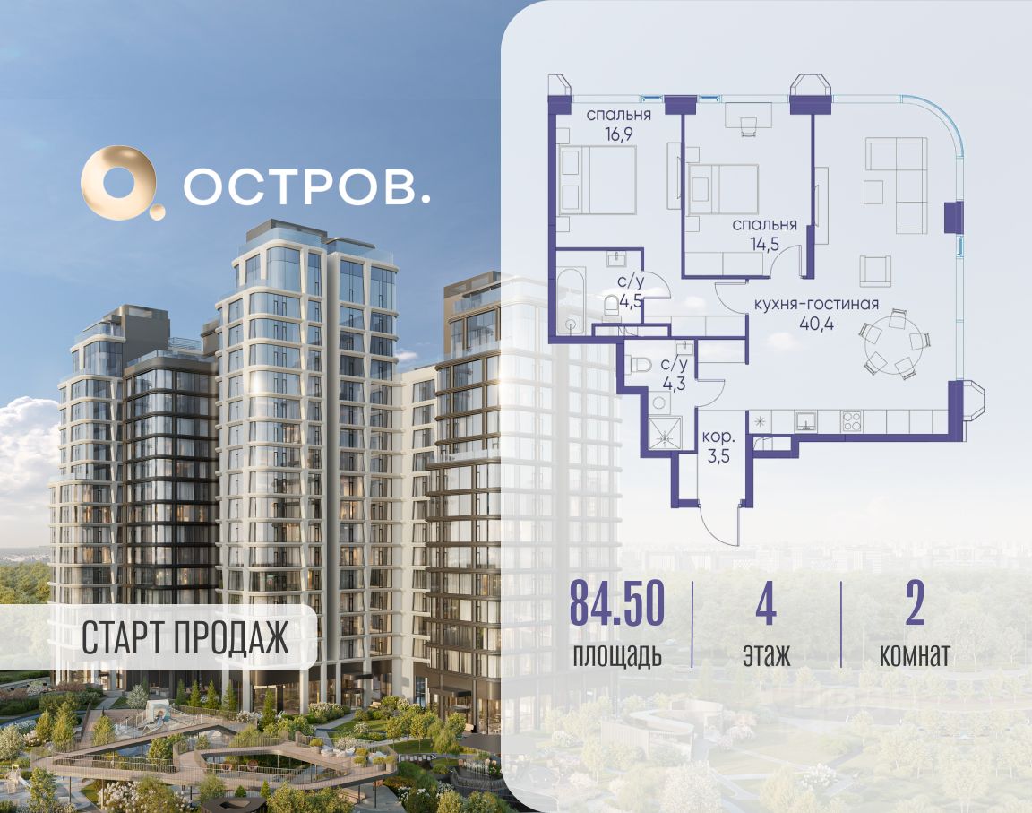 Продаётся 2-комн. квартира от застройщика: общая площадь 84.50 м², жилая 31.40 м², кухня 40.40 м², 4-й этаж, жилой квартал "Остров 12", корпус 1 (секция 1). Срок сдачи: 1 квартал 2029 года.