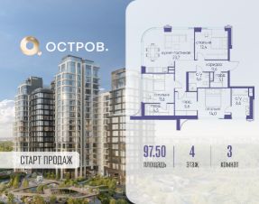 Продаётся 3-комн. квартира от застройщика: общая площадь 97.50 м², жилая 38.00 м², кухня 23.70 м², 4-й этаж, жилой квартал "Остров 12", корпус 1 (секция 2). Срок сдачи: 1 квартал 2029 года.