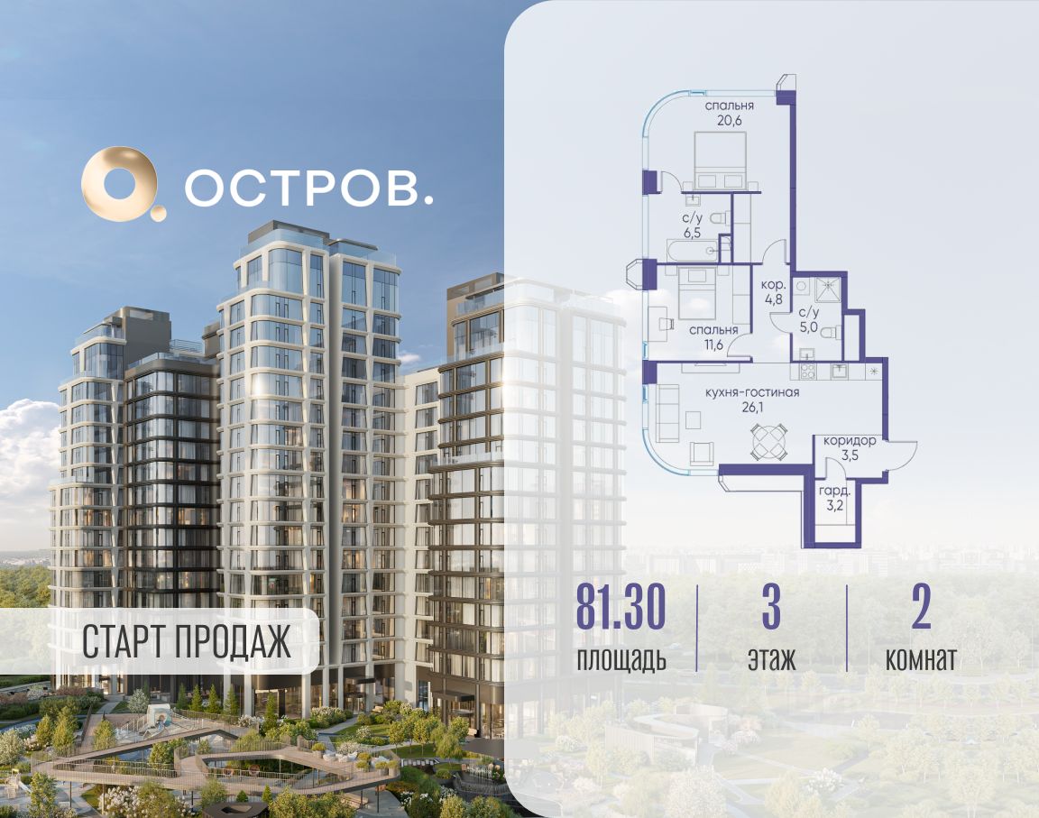 Продаётся 2-комн. квартира от застройщика: общая площадь 81.30 м², жилая 32.20 м², кухня 26.10 м², 3-й этаж, жилой квартал "Остров 12", корпус 1 (секция 1). Срок сдачи: 1 квартал 2029 года.