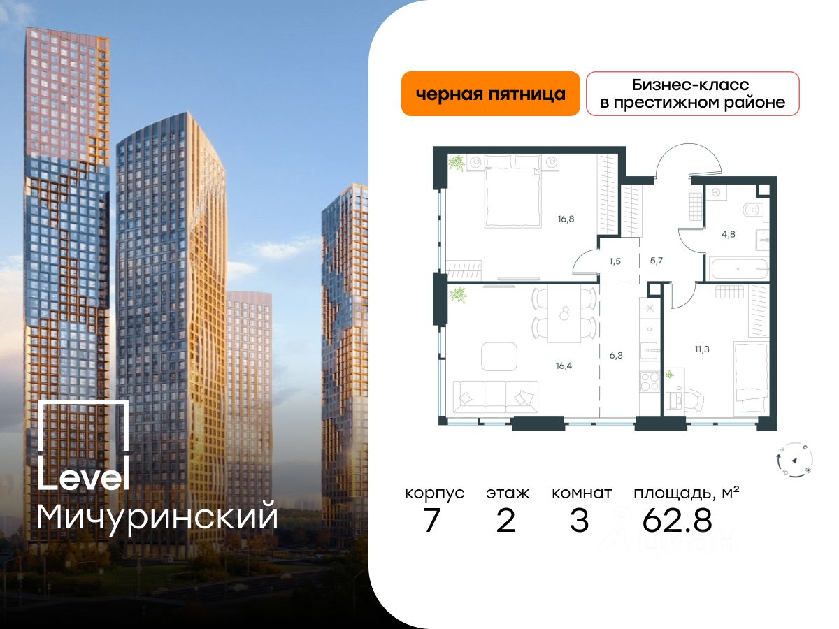 В жилом квартале, расположенном на границе с природным заказником "Долина реки Очаковки", продаётся 3-комнатная квартира площадью 62.80 кв.м без отделки. Квартира расположена на 2 этаже 24-этажного корпуса Корпус 7 в жилом комплексе бизнес-класса Level Мичуринский (компания Level Group/Левел групп).