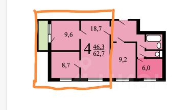 Проходная 18.7м2 и две запроходных: 9.6м2 с выходом на балкон и 8.7м2