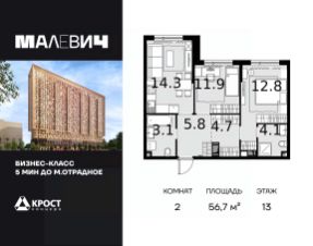 Продаётся 2-к квартира 56.7 кв.м. на 13-м этаже 28 этажного дома.