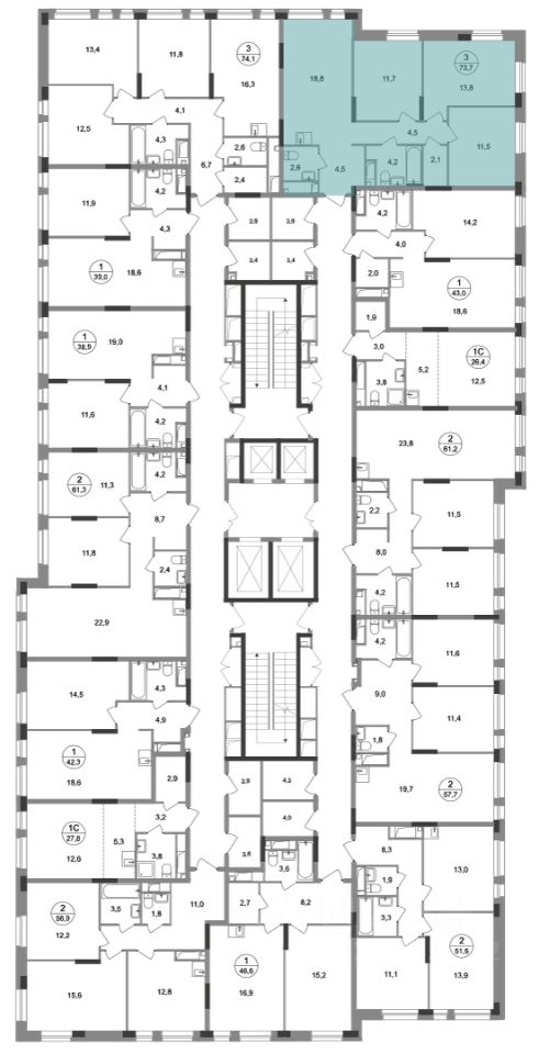 Общая площадь квартиры - 73,7 кв. м, этаж 10 из 19.