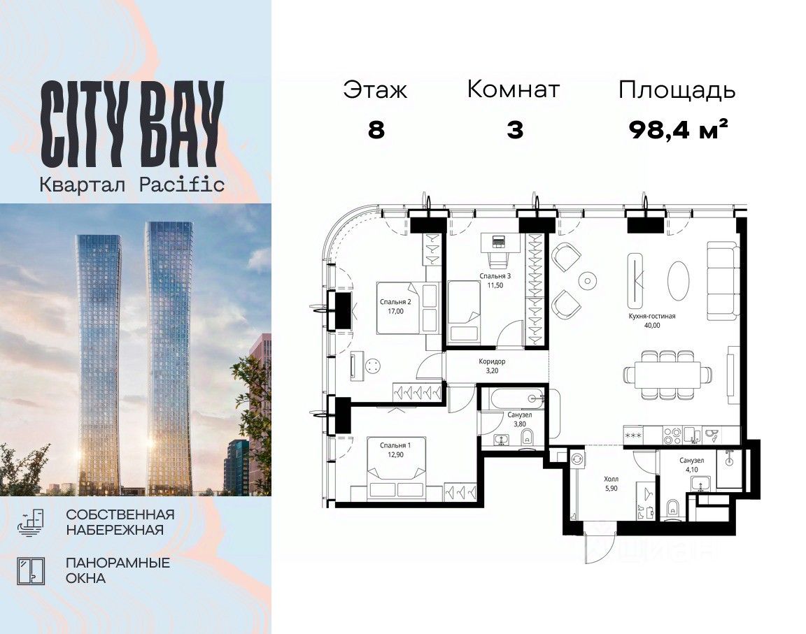 Продаётся 3-комнатная квартира общей площадью 98.40 м² без отделки в ЖК City Вау, квартале Pacific, на 8-м этаже 59 этажного дома.