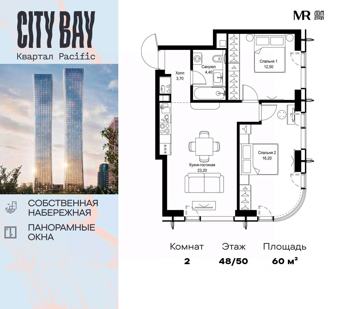 Продаётся 2-к квартира общей площадью 60 м² без отделки в ЖК City Вау, квартале Pacific, на 48-м этаже 50 этажного дома.