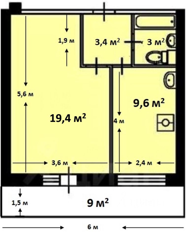 9,6 м²