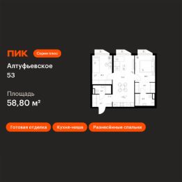 Продаётся 2-комн. квартира площадью 58,8 кв.м на 3 этаже 32 этажного дома (Корпус 1.1, Секция 2) проекта ПИК Алтуфьевское 53. Светлый просторный подъезд на уровне земли, функциональная планировка, большие окна, c отделкой.