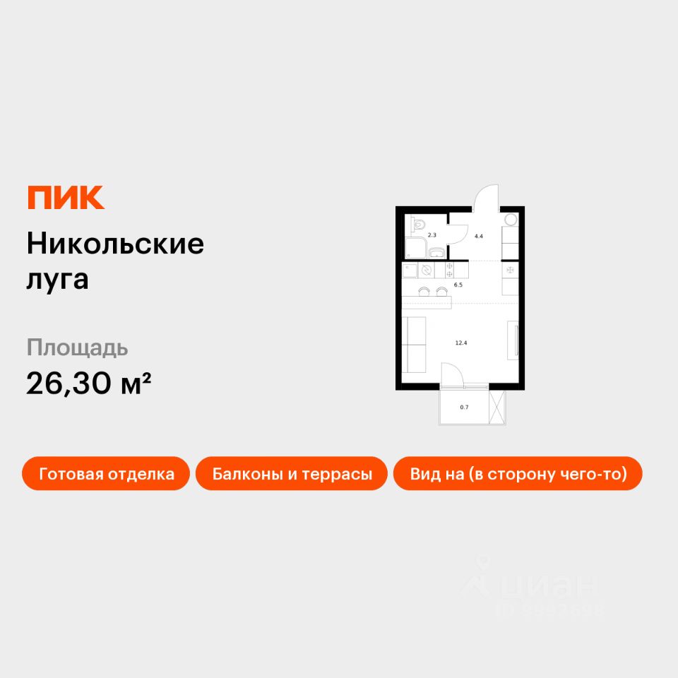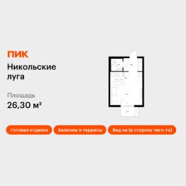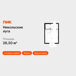 Продаётся квартира-студия площадью 26,3 кв.м на 4 этаже 11 этажного дома (Корпус 4, Секция 2) проекта ПИК Никольские луга. Светлый просторный подъезд на уровне земли, функциональная планировка, большие окна, c отделкой.