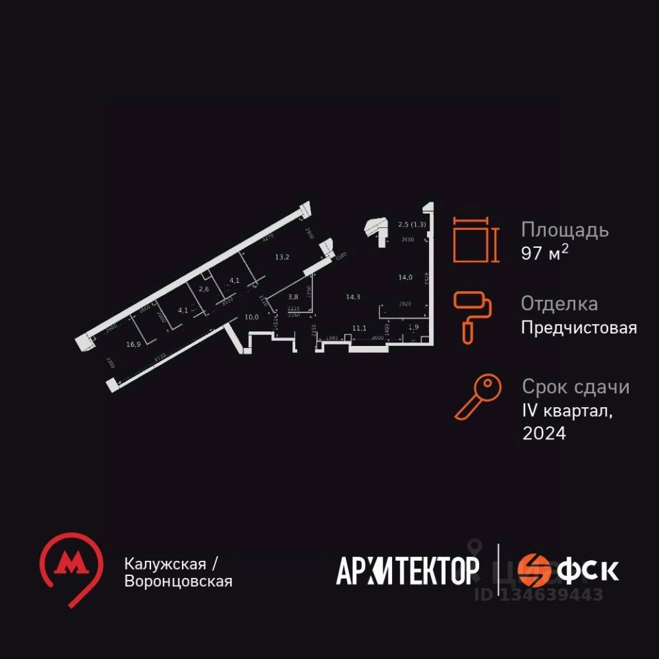 Продаётся 3-к квартира номер 1392 общей площадью 97.3 кв.м. на 27-м этаже 47 этажного здания. Отделка Whitebox. Цена с учётом скидки.
