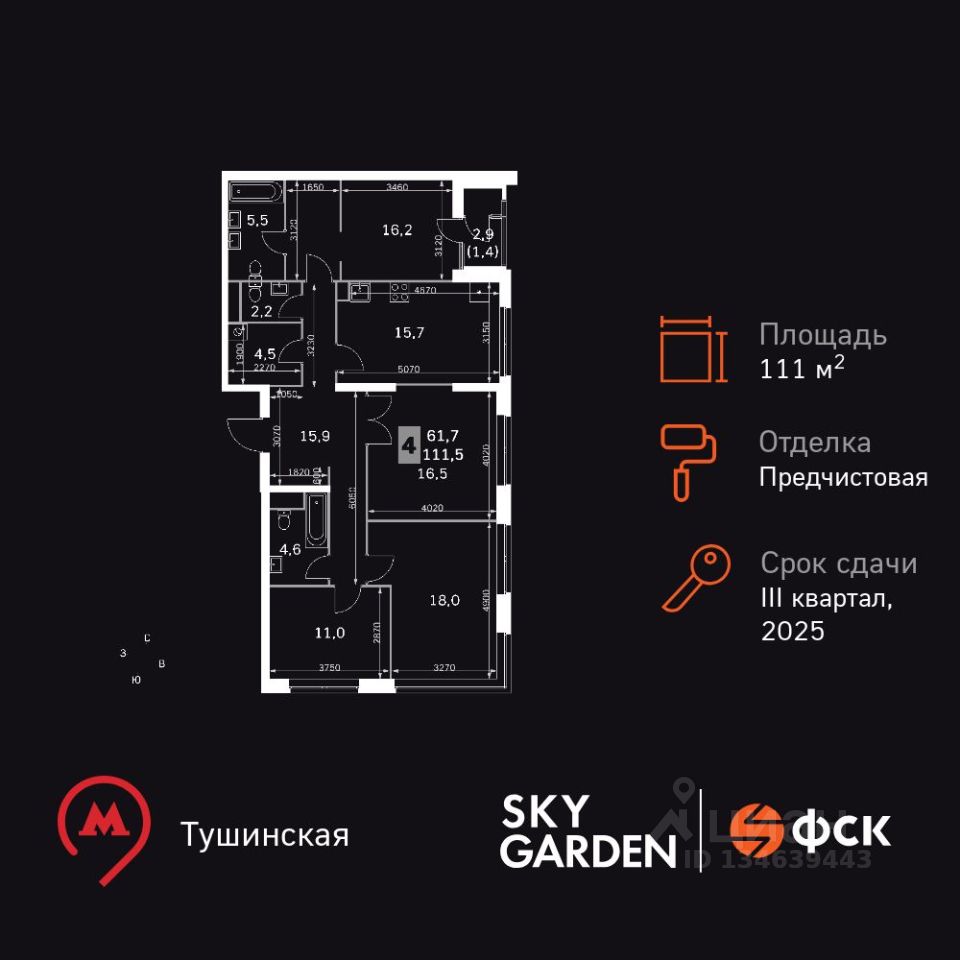 Продаётся 4-к квартира номер 1310 общей площадью 111.5 кв.м. на 23-м этаже 30 этажного здания. Отделка Whitebox. Цена с учётом скидки.