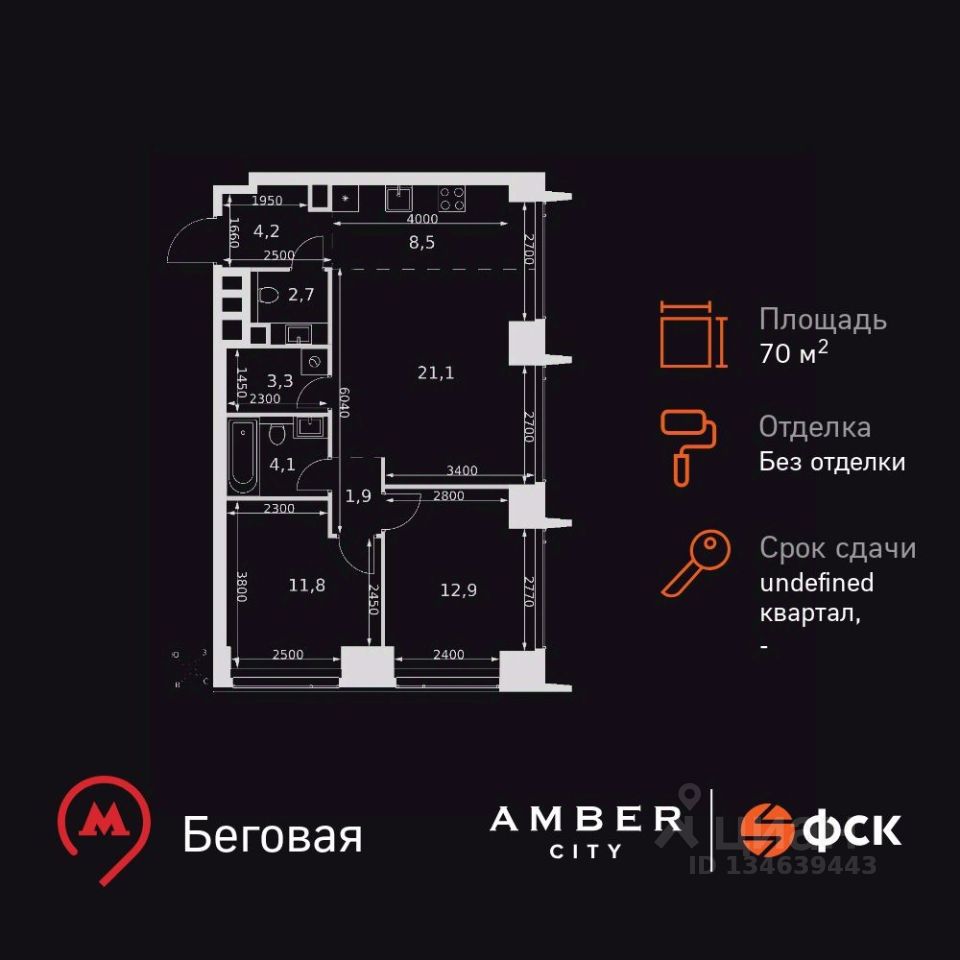Продаётся 3-к квартира номер 637 общей площадью 70.5 кв.м. на 2-м этаже 57 этажного дома. Без отделки. Цена с учётом скидки!