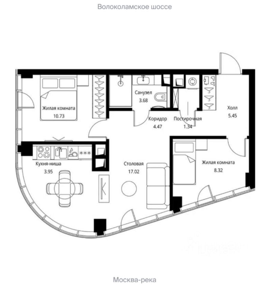 Общая площадь 54.3 м2 . Кухня гостиная 21м2. Две изолированные комнаты. Сан узел . Гардеробная. Панорамные высокие окна.