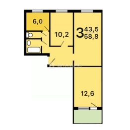 Квартира расположена по адресу: шоссе Энтузиастов, 94к1. Общая площадь — 58,8 кв. м, жилая — 43,5 кв. м, площадь кухни — 6 кв. м. Комнаты изолированные, их площади составляют 10,2 кв. м, 20,7 кв. м и 12,6 кв. м. Евроремонт, удобная планировка, есть балкон. Окна выходят во двор.