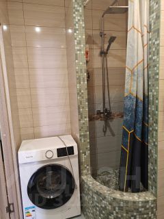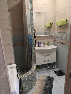 В квартире выполнен дизайнерский ремонт. Пол - ламинат + плитка. Стены - обои. Санузел совмещенный, в плитке, с душевой кабинкой. Установлены водосчетчики.