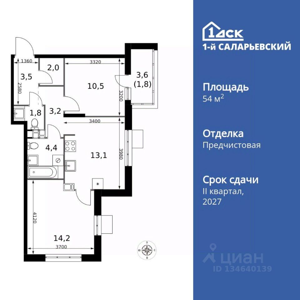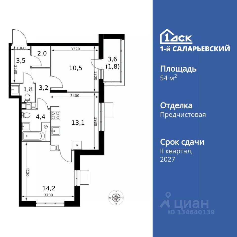 Продаётся 2-к квартира номер 110 общей площадью 54.5 кв.м. на 11-м этаже 25 этажного здания. Отделка Whitebox. Цена с учётом скидки.