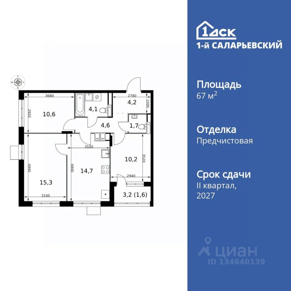 Продаётся 3-к квартира номер 169 общей площадью 67 кв.м. на 17-м этаже 25 этажного здания. Отделка Whitebox. Цена с учётом скидки.