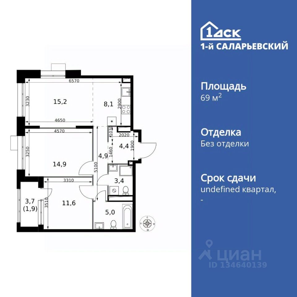 Продаётся 3-к квартира номер 310 общей площадью 69.4 кв.м. на 14-м этаже 25 этажного дома. Без отделки.