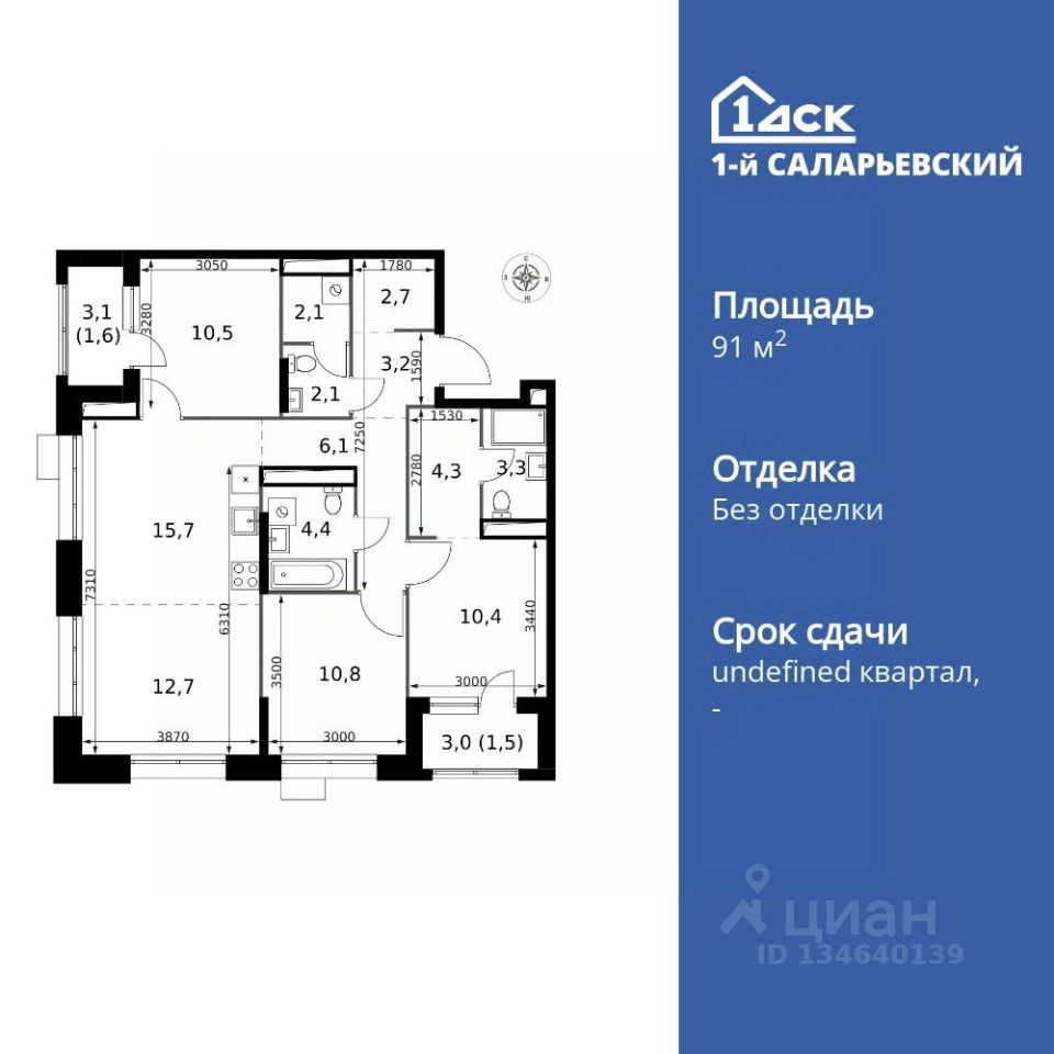 Продаётся 4-к квартира номер 308 общей площадью 91.4 кв.м. на 14-м этаже 25 этажного дома. Без отделки.