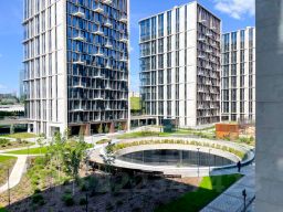 Закрытый зелёный двор Victory Garden с зонами отдыха, барбекю, мини-прудами и шезлонгами. Есть большая детская площадка, а для спорта — велодорожки, баскетбольная площадка и места для йоги.