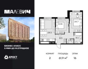 Продаётся 2-к квартира 61.9 кв.м. на 16-м этаже 28 этажного дома.