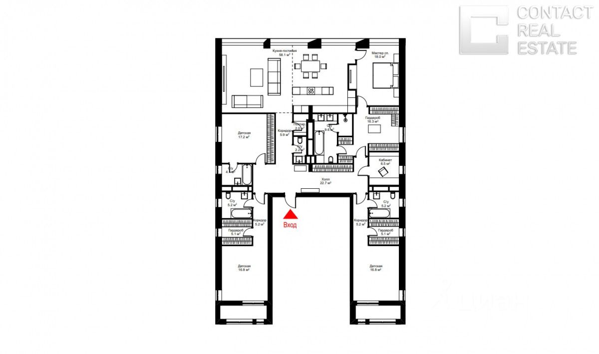 Большая шестикомнатная квартира без отделки в "Садовых Кварталах". Удобная и нестандартная планировка позволяет обустроить гостиную, совмещенную с кухней-столовой, 4 спальни — каждую с собственными ванными и гардеробными комнатами, кабинет с собственным санузлом, две лоджии, несколько гардеробов, гостевые санузлы и постирочные. Будущие владельцы могут скорректировать планировочное решение, обустроив квартиру под свой образ жизни и предпочтения.