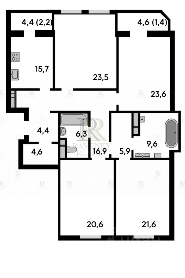 Планировкой предусмотрены кухня-столовая, изолированная гостиная, три спальни, три санузла, гардеробная, холл.