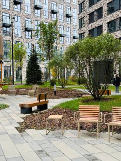 Во дворе можно найти несколько детских площадок и зону отдыха с большим количеством сидячих мест.