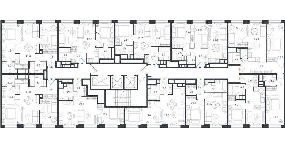 между квартирами светлые холлы. керамогранитный пол, энергоэффективная подсветка и цветовые акценты. никакой монотонности.