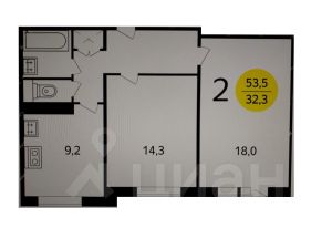 Общая площадь — 53,5 м². Планировка линейка, с относительно большими жилыми комнатами (14,2 и 18 кв.м.). Кухня отвечает потребностям семьи из 3-4 человек. Окна выходят не на подъезд, а на улицу, что тоже важно.