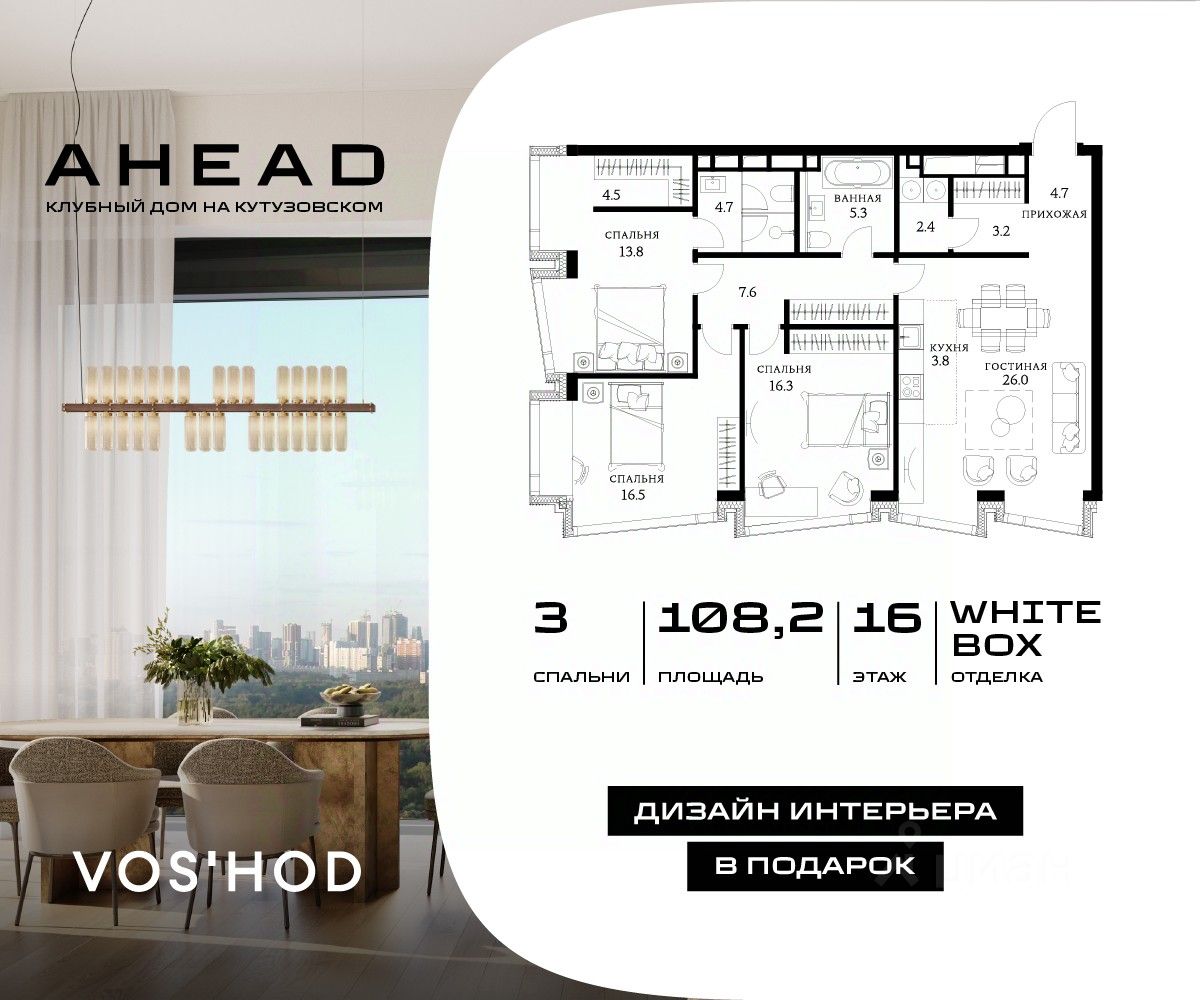 Апартамент в клубном доме премиум-класса AHEAD площадью 108,2 кв.м. на 16-м этаже с тремя спальнями и просторной кухней-гостиной. Потолок высотой 3,2 м. Панорамные окна выходят на Парк Победы откуда открываются потрясающие виды. Инженерное оснащение выполнено с учетом современных технологических решений: централизованная система кондиционирования VRF с возможностью регулировки температурного режима в каждом помещении, скрытые бесшумные воздуховоды, качественная звукоизоляция, устанавливаются внутрипольные конвекторы. Двухкамерные стеклопакеты Schco с алюминиевым профилем, обладают высокими показателями шумопоглощения и оснащены возможностью проветривания. Стекла покрыты светоотражающим напылением. Отделка White box.