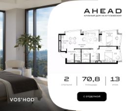 Ahead это эксклюзивный проект в центре столицы, включающий всего 77 резиденций, что гарантирует приватность и комфорт для жильцов. Комплекс отличается авторской архитектурой от бюро "Цимайло Ляшенко и Партнёры", а из окон открываются панорамные виды на Парк Победы, Воробьёвы горы и Москва-Сити. Внутреннее пространство оформлено с особым вниманием к деталям: лобби создано студией UNK Interiors, а двор благоустроен в японском стиле с 58-метровым водопадом высотой 4,5 м и сосной "ниваки". Все резиденции предлагаются с отделкой White Box. При покупке ряда апартаментов владелец получает в качестве бонуса готовый дизайн-проект с рабочей документацией от известной студии дизайна BALCON, что в разы ускорит и упростит процесс превращения "белого листа" в продуманное и комфортное пространство для жизни. Для удобства жильцов на седьмом этаже расположен клубный этаж Sky Lobby, включающий Sky Social Club с панорамной террасой, фитнес-зону Air Fitness с кардиозоной и залом для йоги и пилатеса, а также коворкинг-трансформер с отдельной переговорной. В комплексе предусмотрен современный подземный паркинг с биометрическим контролем доступа, распознаванием госномеров и возможностью установки зарядок для электрокаров. На всей территории действует Wi-Fi. Расположение комплекса обеспечивает отличную транспортную доступность: до Москва-Сити и Киевского вокзала можно добраться за 10 минут на автомобиле, до инновационного центра Сколково — за 15 минут. Комплекс оснащён современными технологиями и системами безопасности, включая биометрический доступ по Face ID, умную систему управления домом, приточно-вытяжную вентиляцию, центральное кондиционирование и круглосуточный мониторинг. AHEAD — это пространство для комфортной жизни в сердце Москвы, где каждая деталь создана для благополучия жильцов.