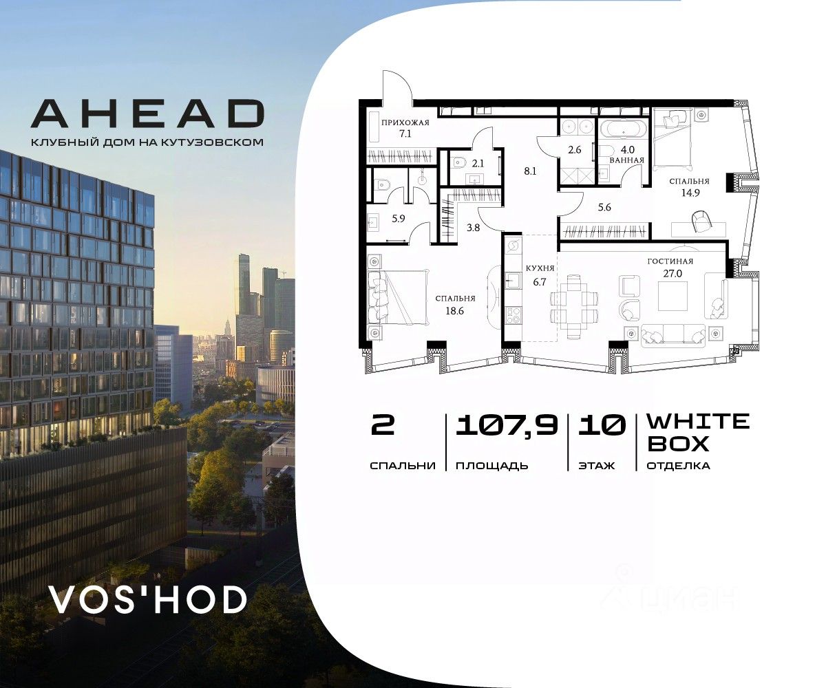 Апартамент в клубном доме премиум-класса AHEAD площадью 107,9 кв.м. на 10-м этаже с двумя спальнями и просторной кухней-гостиной. Потолок высотой 3,2 м. Панорамные окна выходят на Парк Победы и Москва-Сити откуда открываются потрясающие виды. Инженерное оснащение выполнено с учетом современных технологических решений: централизованная система кондиционирования VRF с возможностью регулировки температурного режима в каждом помещении, скрытые бесшумные воздуховоды, качественная звукоизоляция, устанавливаются внутрипольные конвекторы. Двухкамерные стеклопакеты Schco с алюминиевым профилем, обладают высокими показателями шумопоглощения и оснащены возможностью проветривания. Стекла покрыты светоотражающим напылением. Отделка White box.