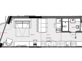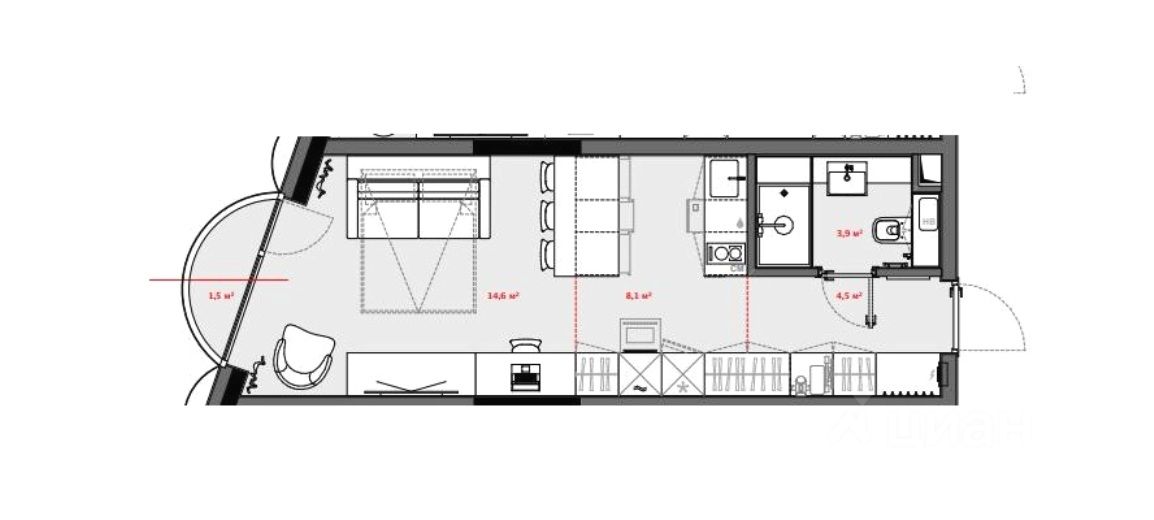 Студия без отделки. На плане представлен воможный вариант органиации пространства.