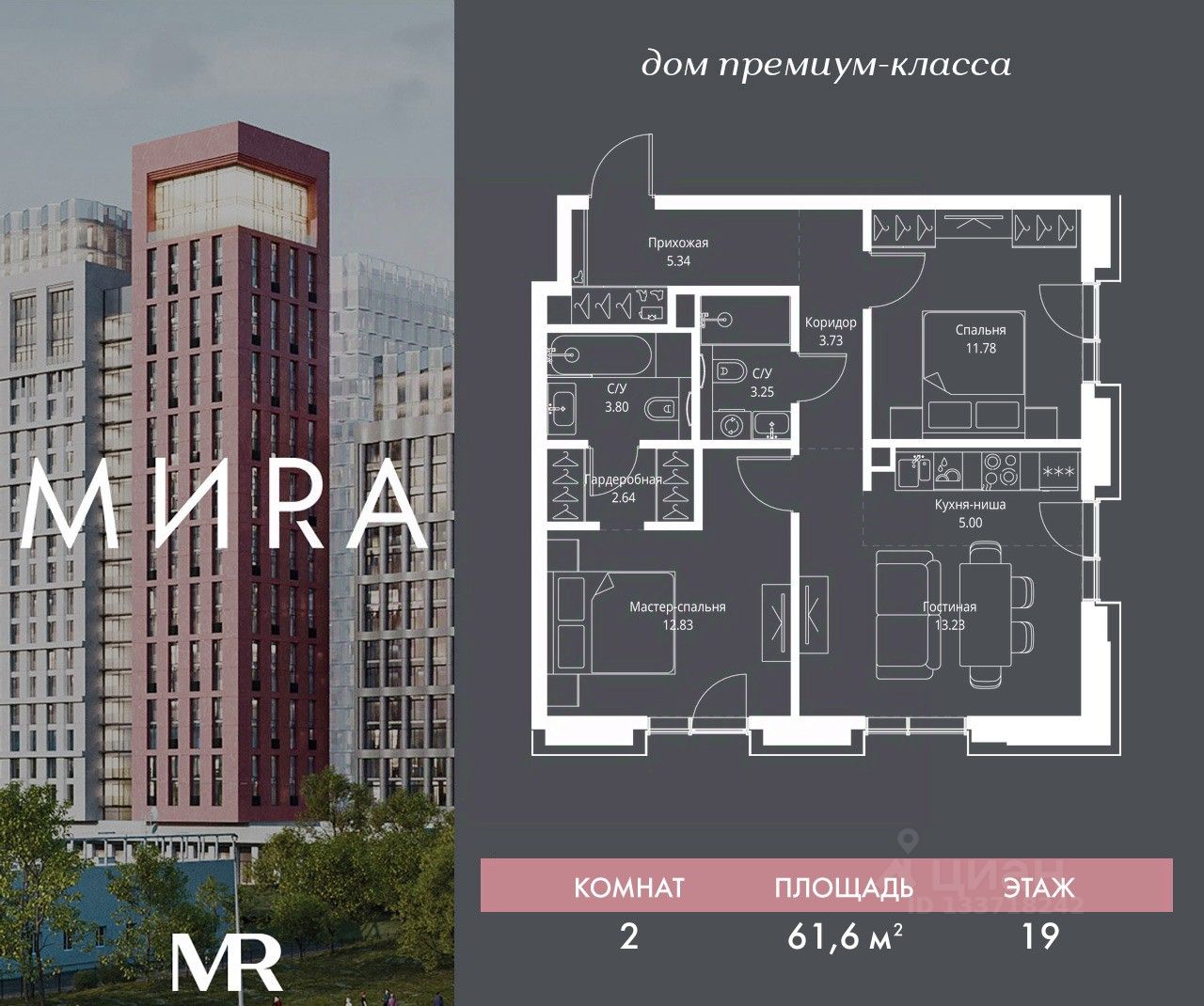 Продаётся 2-комнатная квартира общей площадью 61.60 м² без отделки в доме премиум-класса МИRА на 19-м этаже 23 этажного дома. Квартира расположена в корпусе 2.