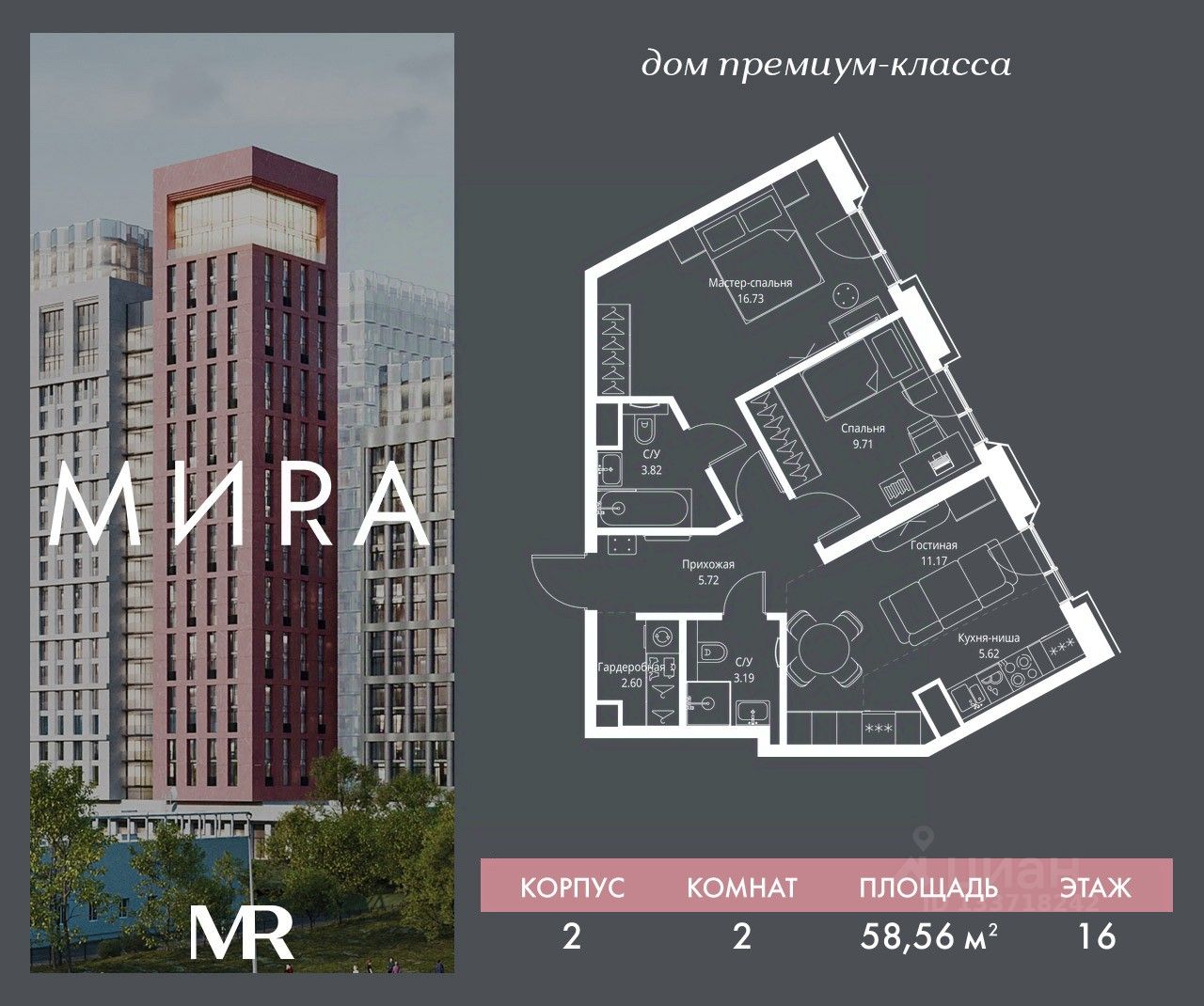Продаётся 2-к квартира общей площадью 58.56 м² без отделки в доме премиум-класса МИRА на 16-м этаже 23 этажного дома. Квартира расположена в корпусе 2.