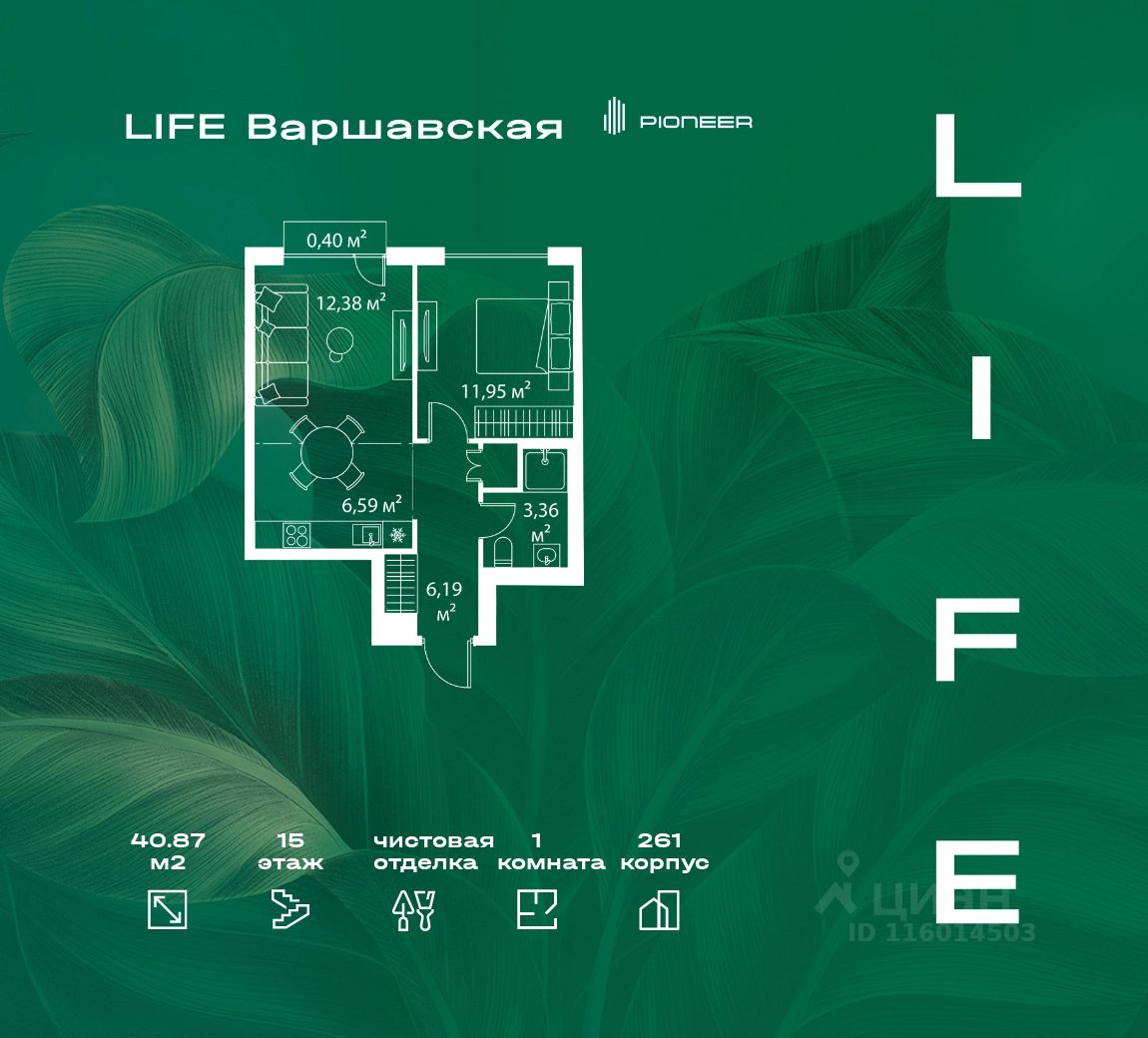 В районе Москворечье-Сабурово продается 1-комнатная квартира площадью 40.87 м². Она расположена на 15 этаже в 261 корпусе нового жилого квартала LIFE Варшавская.