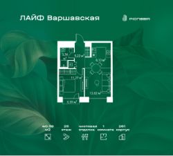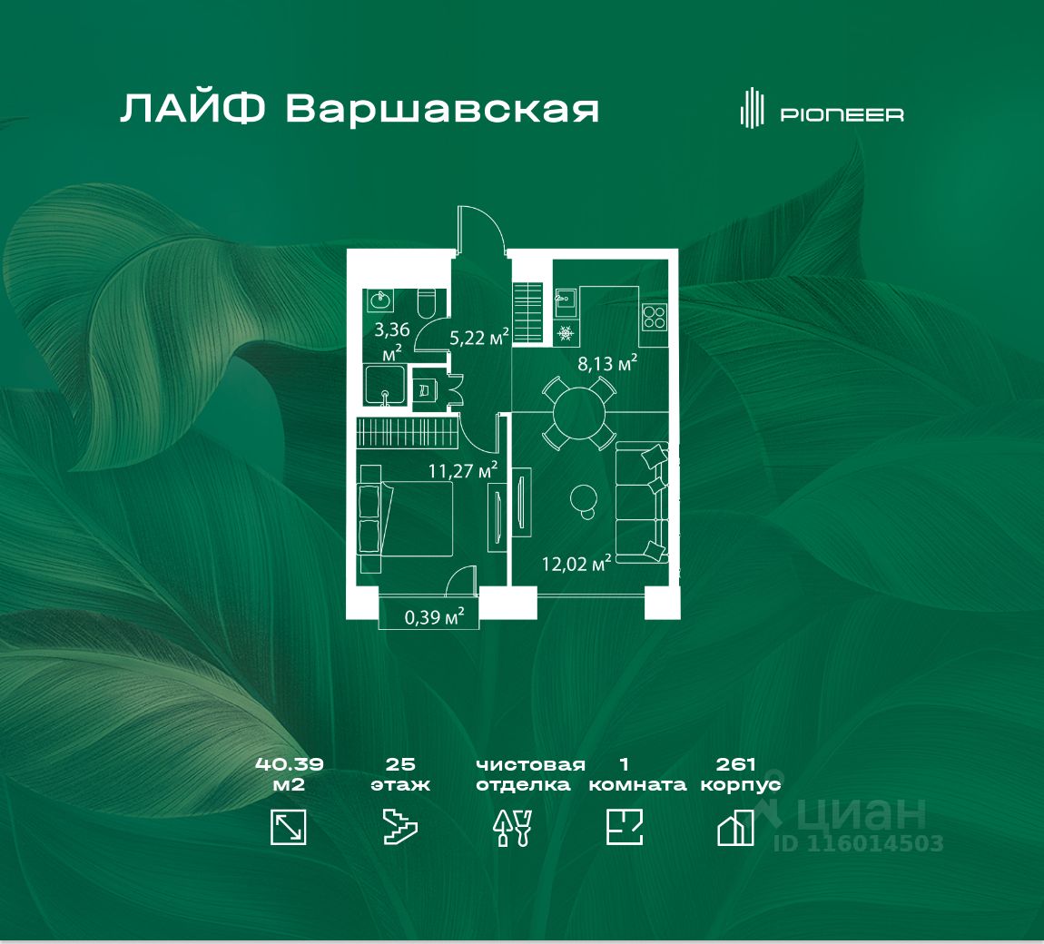 В районе Москворечье-Сабурово продается 1-комнатная квартира площадью 40.39 м². Она расположена на 25 этаже в 261 корпусе нового жилого квартала Лайф Варшавская.