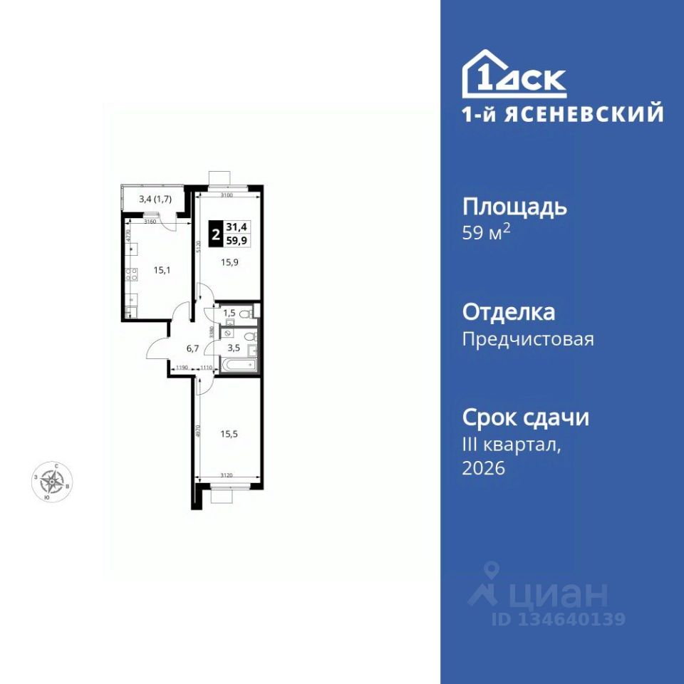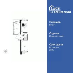 Продаётся 2-к квартира номер 348 общей площадью 59.9 кв.м. на 4-м этаже 9 этажного здания. Отделка Whitebox. Цена с учётом скидки.