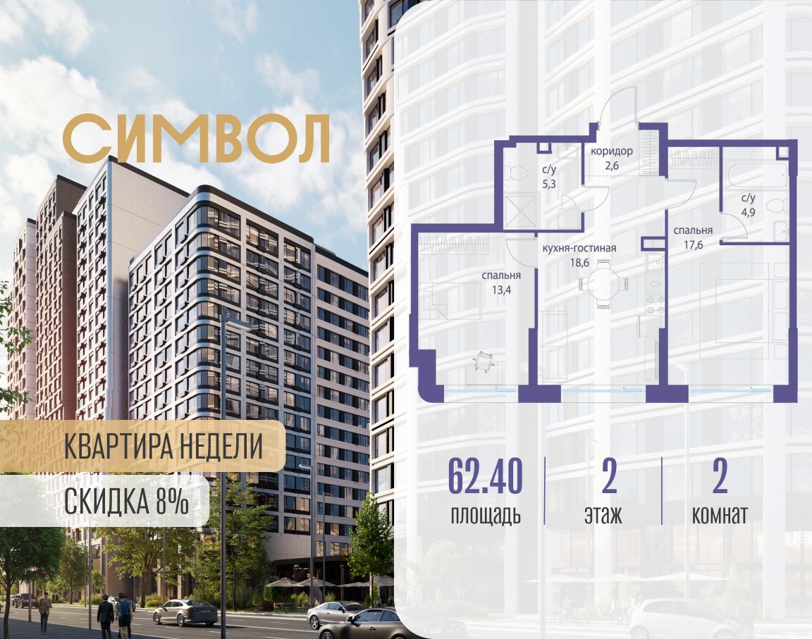 Продается 2-комнатная квартира от застройщика: общая площадь 62.40 м², жилая 31.00 м², кухня 18.60 м², 2-й этаж, жилой квартал "Гордость", корпус 36 (секция 3). Срок сдачи: 2 квартал 2029 года.