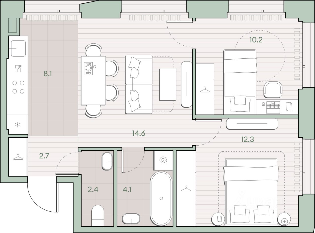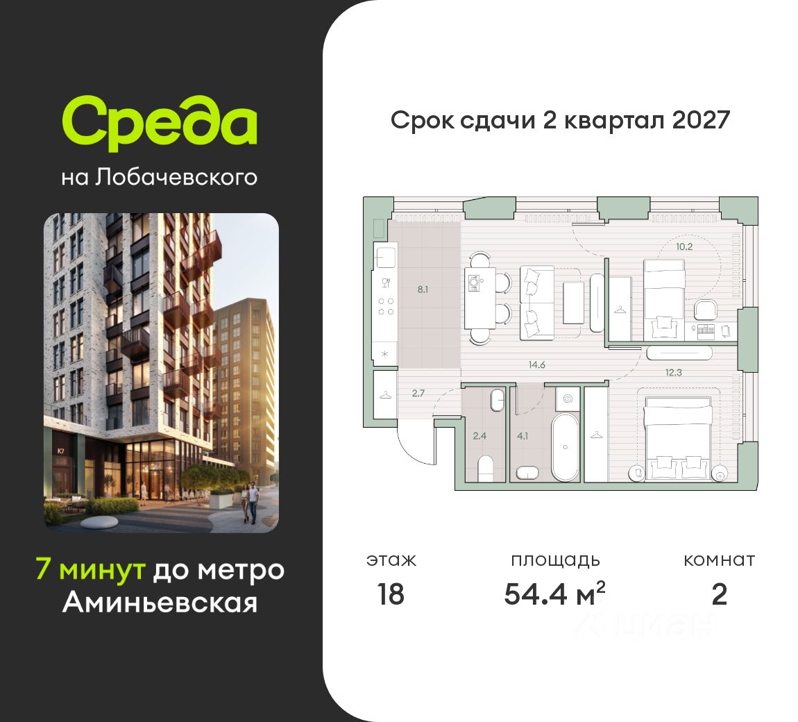 Продаётся 2-комнатная квартира общей площадью 54.4 кв.м. с отделкой white box. Квартира расположена на 18 этаже корпуса 5.4 в жилом комплексе бизнес-класса "Среда на Лобачевского" в пешей доступности от метро "Аминьевская".