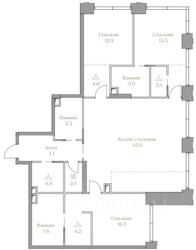 Представляем квартиру в клубном доме Гарден 3 с 3 спальнями площадью 132,9 м2 на 15 этаже.