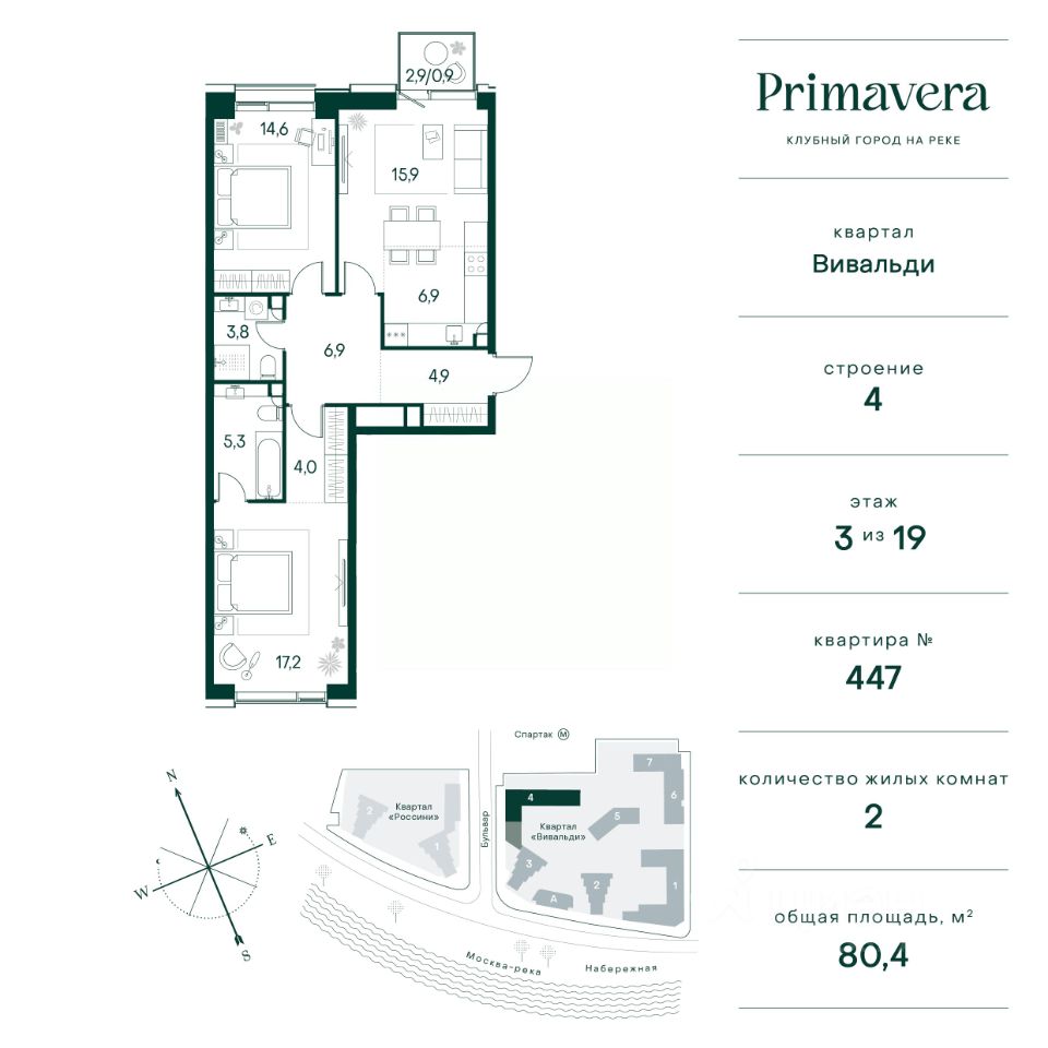 Клубный город на реке Primavera — это современный жилой комплекс премиум-класса, расположенный на первой береговой линии Москвы-реки в экологически чистом районе Покровское-Стрешнево. Под панорамными окнами квартир находится собственный экопарк с продуманной сетью прогулочных дорожек и современными детскими и спортивными площадками. За парком расположена набережная с собственным пляжем и зонами для отдыха. Клубный город на реке Primavera предлагает широкий выбор планировок для различных жизненных сценариев: от просторных однокомнатных квартир до пентхаусов и жилых помещений с террасами и патио. Выберите из 120 вариантов эргономичных планировок стандартного и евроформата. Из каждой квартиры открываются красивые виды на реку с углом обзора в 270 градусов. Дизайнерские лобби предлагают панорамный обзор на благоустроенный двор. Высокие потолки в 6 метров и качественная отделка создают атмосферу, схожую с пятизвездочными отелями. В Primavera есть всё необходимое для комфортной жизни в мегаполисе: • Образование для детей в шаговой доступности: 4 школы, 8 детских садов и развивающие центры с кружками и секциями. • Удобства на расстоянии приятной прогулки: супермаркеты, кафе, рестораны с верандами, салоны красоты, аптеки и многофункциональный центр для шоппинга и развлечений. • Умный дом: автоматизированное бесконтактное управление основными системами доступа и безопасности через мобильное приложение. Клубный город на реке Primavera выгодно сочетает комфорт городской жизни с близостью к природе. Живите в месте, где все создано для вашего удобства!