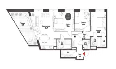 Грамотная планировка квартиры: просторная кухня-гостиная 26,9 кв.м., изолированные комнаты 14,6 кв.м., 11,3 кв м. и мастер-спальня 15,2 кв. м., со своим санузлом и гардеробной, просторный коридор, гардеробная, 2 санузла.