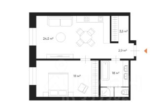 Планировочное решение: кухня-гостиная, спальня, ванная комната, гардеробная с постирочной зоной. Из квартиры открывается панорамный вид на Тессинский переулок.