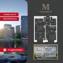 Продаётся 2-к квартира 44,2 кв.м. в ЖК "Михалковский" на 4-м этаже 9 этажного дома.