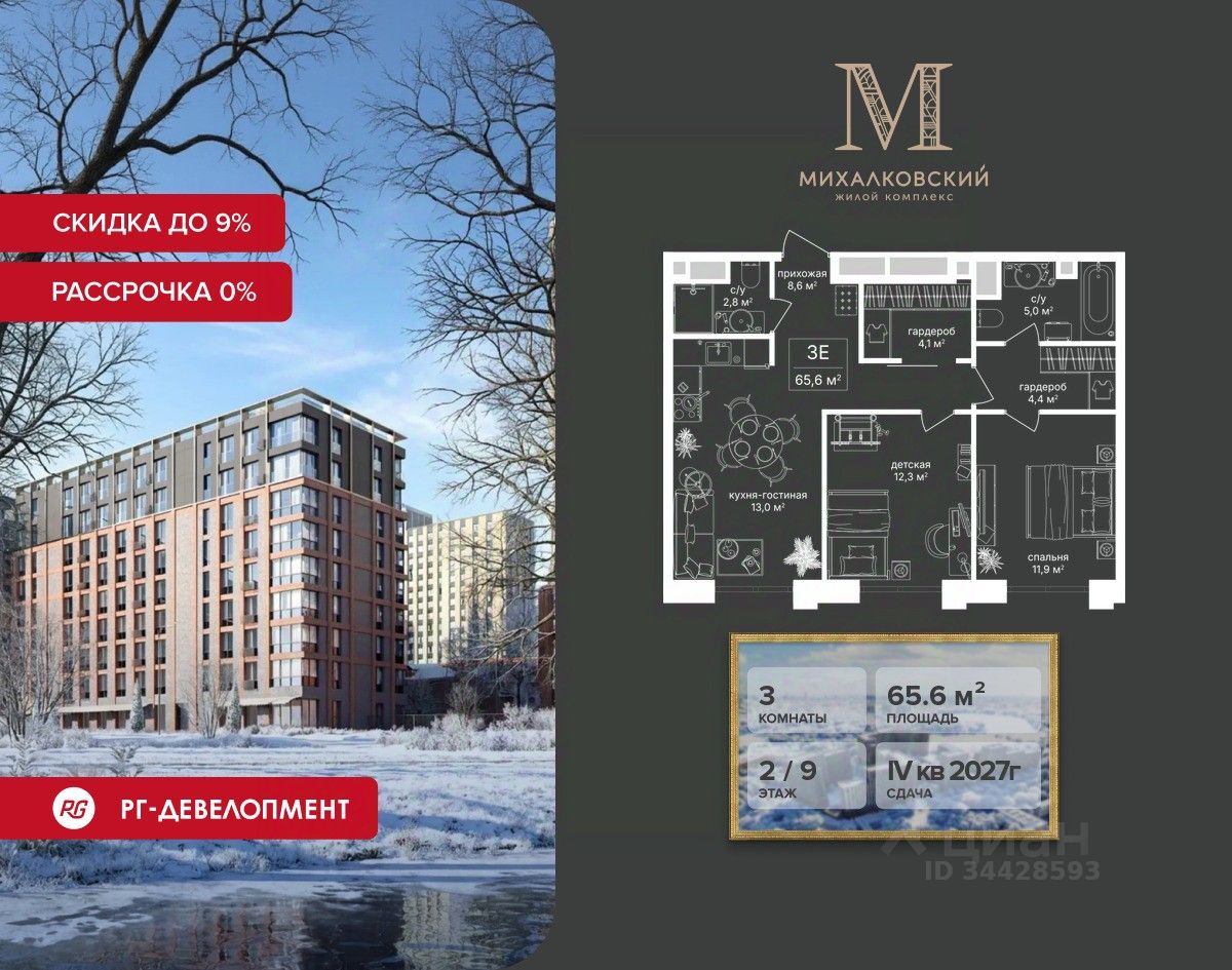 Продаётся 3-к квартира 65,6 кв.м. в ЖК "Михалковский" на 2-м этаже 9 этажного дома.