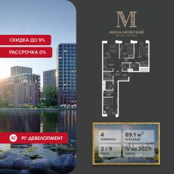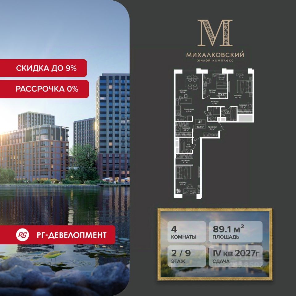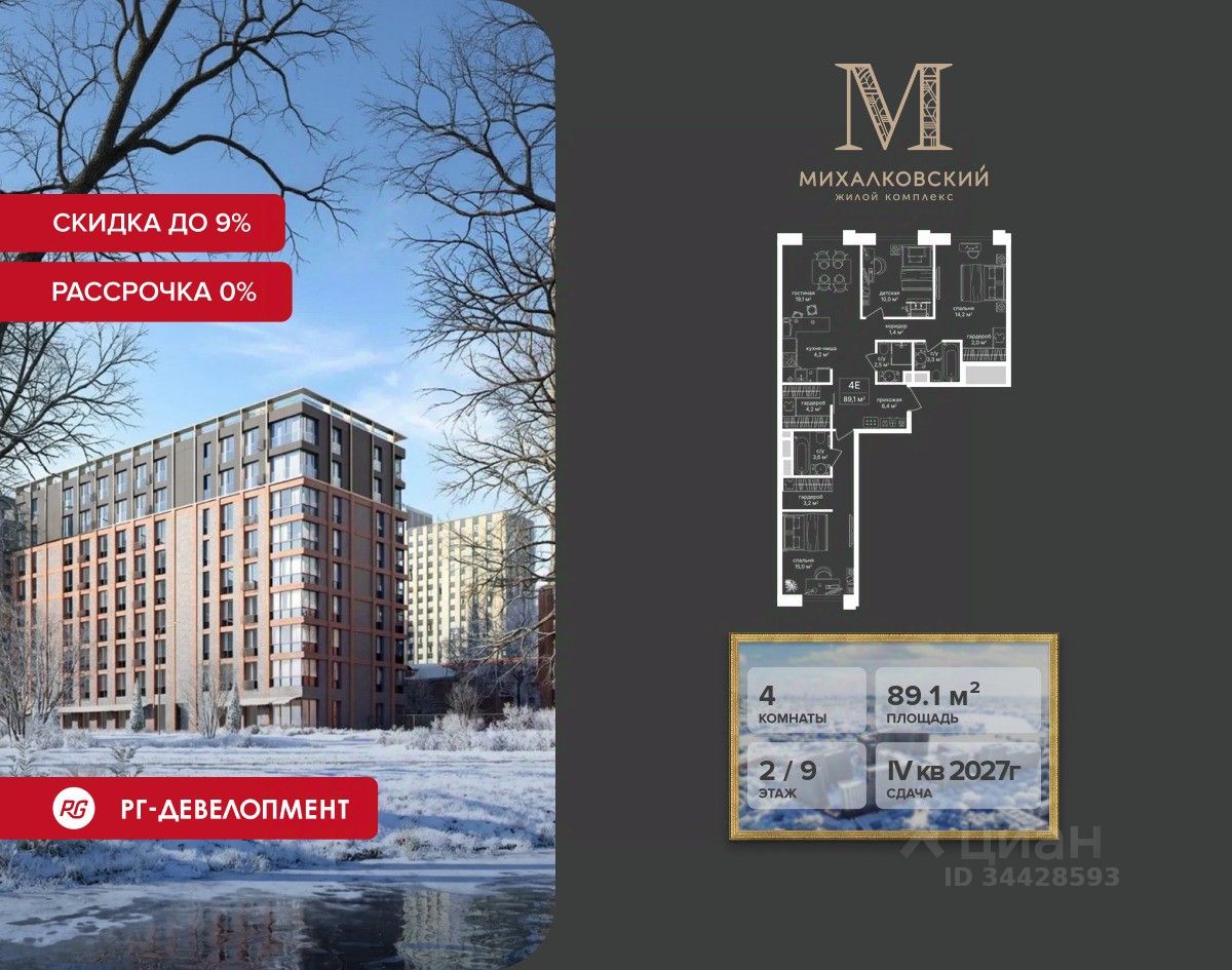 Продаётся 4-к квартира 89,1 кв.м. в ЖК "Михалковский" на 2-м этаже 9 этажного дома.