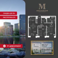 Продаётся 3-к квартира 66,3 кв.м. в ЖК "Михалковский" на 3-м этаже 9 этажного дома.