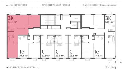 Продается 3-комнатная квартира общей площадью 60.9 кв. метров на 6 этаже жилого комплекса Лучи.