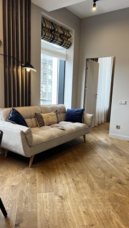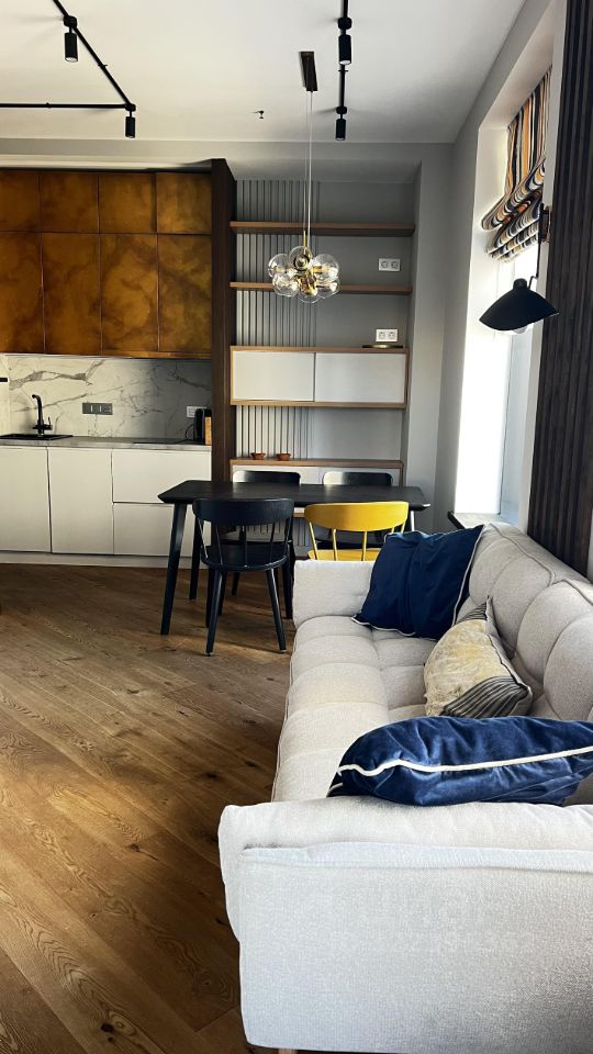 Выполнен очень качественный дизайнерский ремонт ,предусмотрены зоны хранения ,тёплый пол ,несколько окон в каждой комнате ,пространство пропитано светом и любовью